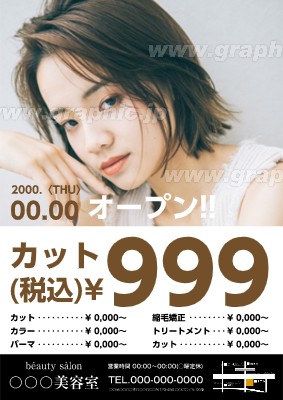 美容室・ヘアサロンのチラシ・フライヤー作成に使える「オープン・開店」がテーマの無料デザインテンプレートです。写真や文字を入れるだけで本格的なチラシ・フライヤーが作成できます。編集後はそのまま印刷注文も可能です。