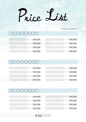 ネイルサロンのチラシ・フライヤー作成に使える「メニュー表・お品書き」がテーマの無料デザインテンプレートです。写真や文字を入れるだけで本格的なチラシ・フライヤーが作成できます。編集後はそのまま印刷注文も可能です。