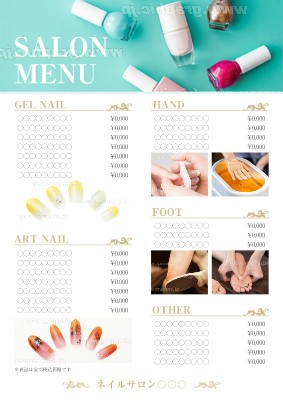 ネイルサロンのチラシ・フライヤー作成に使える「メニュー表・お品書き」がテーマの無料デザインテンプレートです。写真や文字を入れるだけで本格的なチラシ・フライヤーが作成できます。編集後はそのまま印刷注文も可能です。