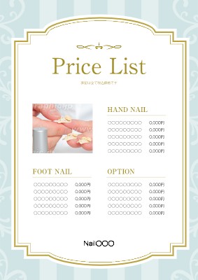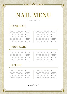 ネイルサロンのチラシ・フライヤー作成に使える「メニュー表・お品書き」がテーマの無料デザインテンプレートです。写真や文字を入れるだけで本格的なチラシ・フライヤーが作成できます。編集後はそのまま印刷注文も可能です。