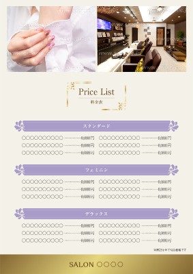 ネイルサロンのチラシ・フライヤー作成に使える「メニュー表・お品書き」がテーマの無料デザインテンプレートです。写真や文字を入れるだけで本格的なチラシ・フライヤーが作成できます。編集後はそのまま印刷注文も可能です。
