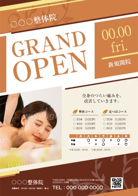 整体・マッサージのチラシ・フライヤー作成に使える「オープン・開店」がテーマの無料デザインテンプレートです。写真や文字を入れるだけで本格的なチラシ・フライヤーが作成できます。編集後はそのまま印刷注文も可能です。
