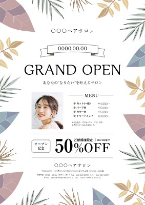 美容室・ヘアサロンのチラシ・フライヤー作成に使える「オープン・開店」がテーマの無料デザインテンプレートです。写真や文字を入れるだけで本格的なチラシ・フライヤーが作成できます。編集後はそのまま印刷注文も可能です。